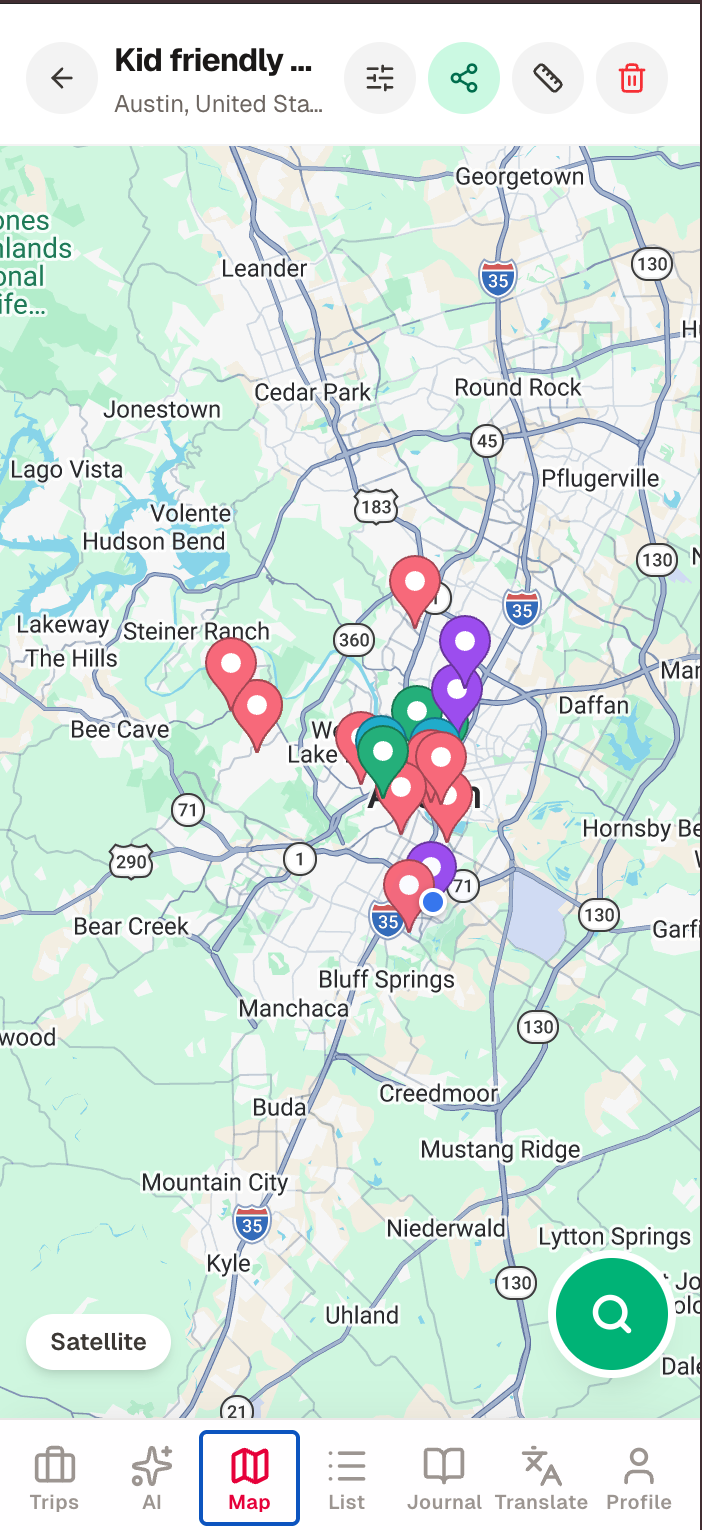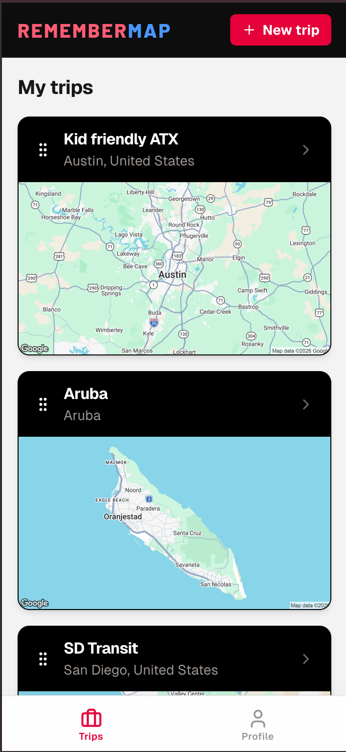 Create a trip for every destination — Austin, Aruba, Tokyo, wherever. Every pin, note, and photo you save lives inside that trip. When you land, everything is already waiting.