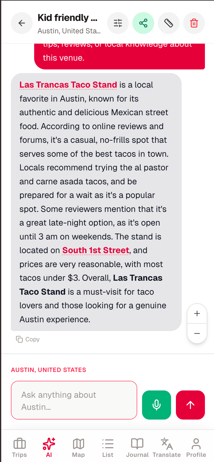 Open the AI tab and ask in plain English — best tacos near your hotel, what to do on a rainy afternoon, which neighborhood to stay in. The AI reads real travel forum discussions, not sponsored content.